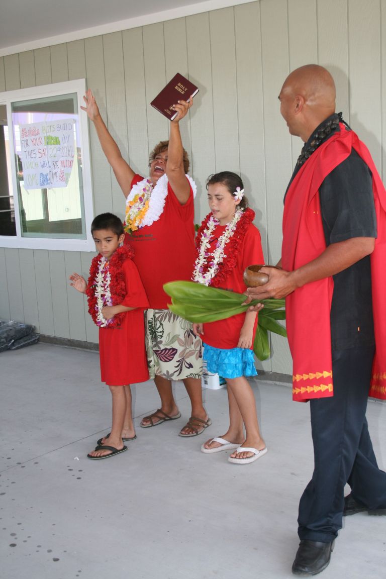 The home blessing ceremony is the culmination of a ten-day Blitz Build, a self-help housing program offered by West Hawai’i’s Habitat for Humanity, where homeowners build five homes in 10 days. Homeowners participate in the construction of their own homes, as well as the homes of their neighbors.