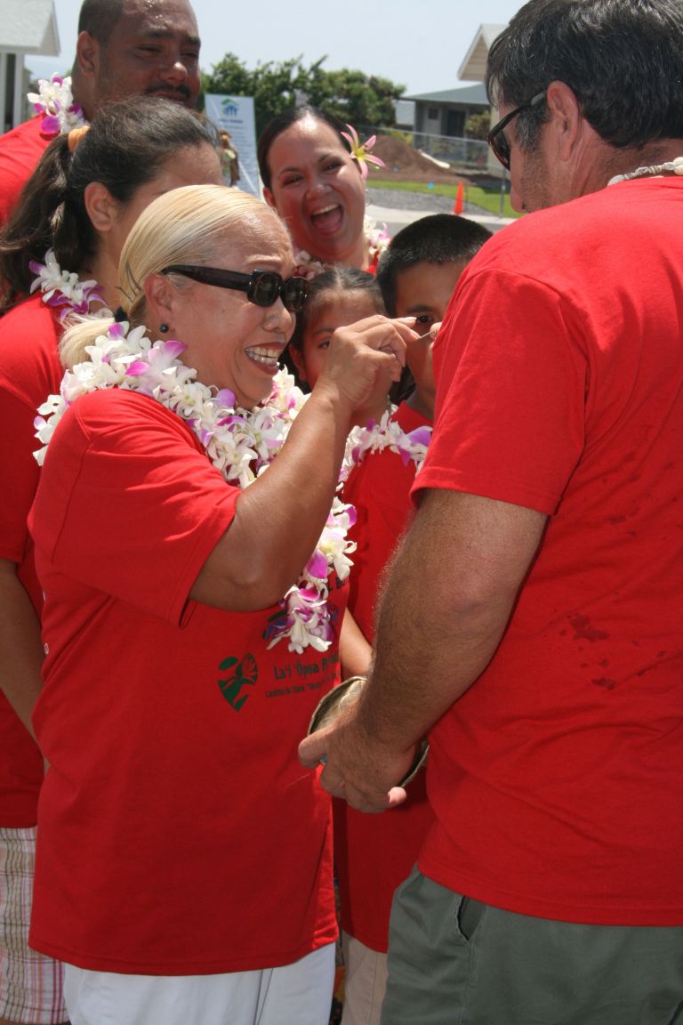 Aloha Kekauoha receives a lei at todayʻs Blitz Build self-help home blessing in Laʻi ʻŌpua Hawaiian homestead, Kona.